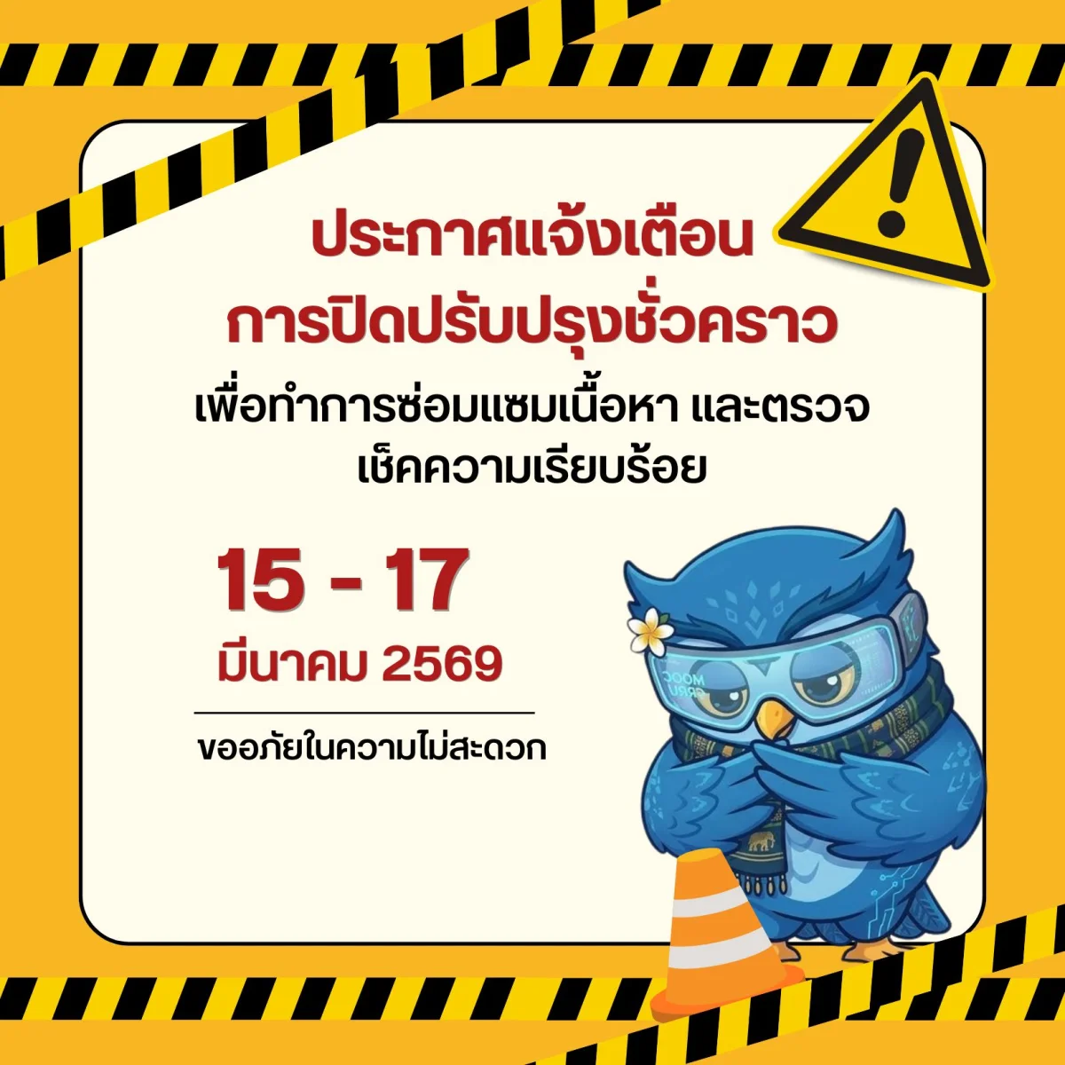 ในระหว่างช่วงเวลาดังกล่าว ผู้เรียนยังคงสามารถเข้าใช้งานระบบได้ตามปกติ* หากท่านพบข้อมูลส่วนใดที่กำลังอยู่ในระหว่างการปรับปรุง ทีมงานขออภัยในความไม่สะดวกมา ณ ที่นี้ เพื่อเป้าหมายในการสร้างสรรค์พื้นที่การเรียนรู้ที่มีคุณภาพที่สุดสำหรับทุกคน